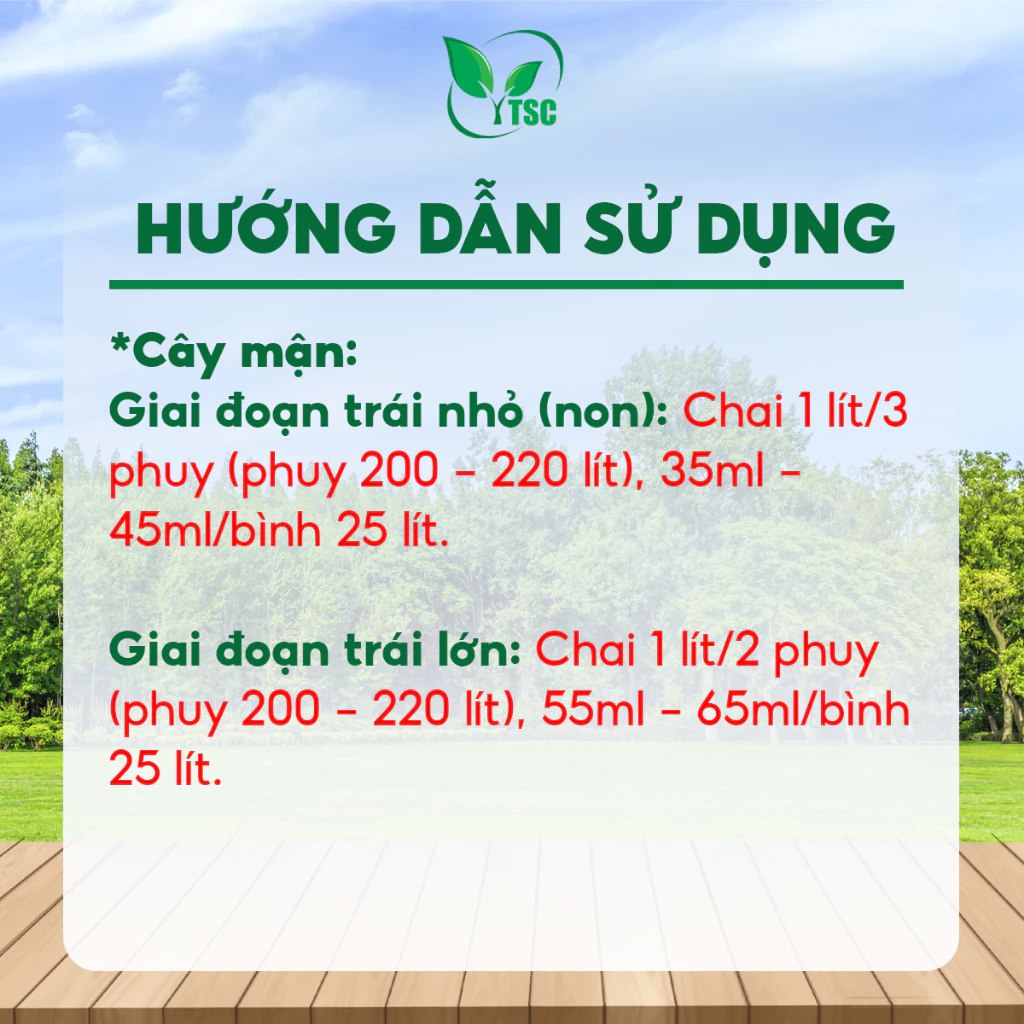 - Giai đoạn trái nhỏ (non): Chai 1 lít/3 phuy (phuy 200 – 220 lít), 35ml – 45ml/bình 25 lít.
