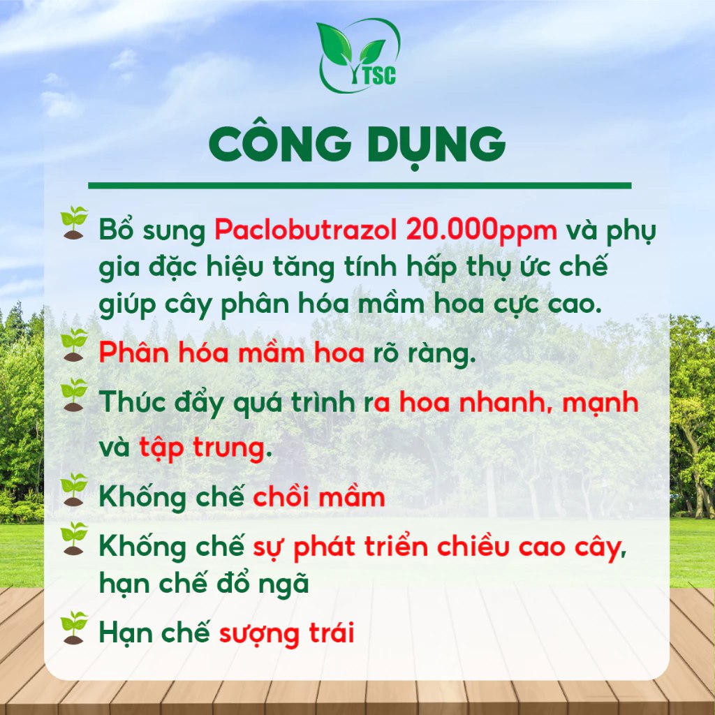- Hỗ trợ khống chế chồi mầm, hạn chế tăng trưởng mầm lá tạo tiền đề để cây ra hoa đồng loạt sau này.