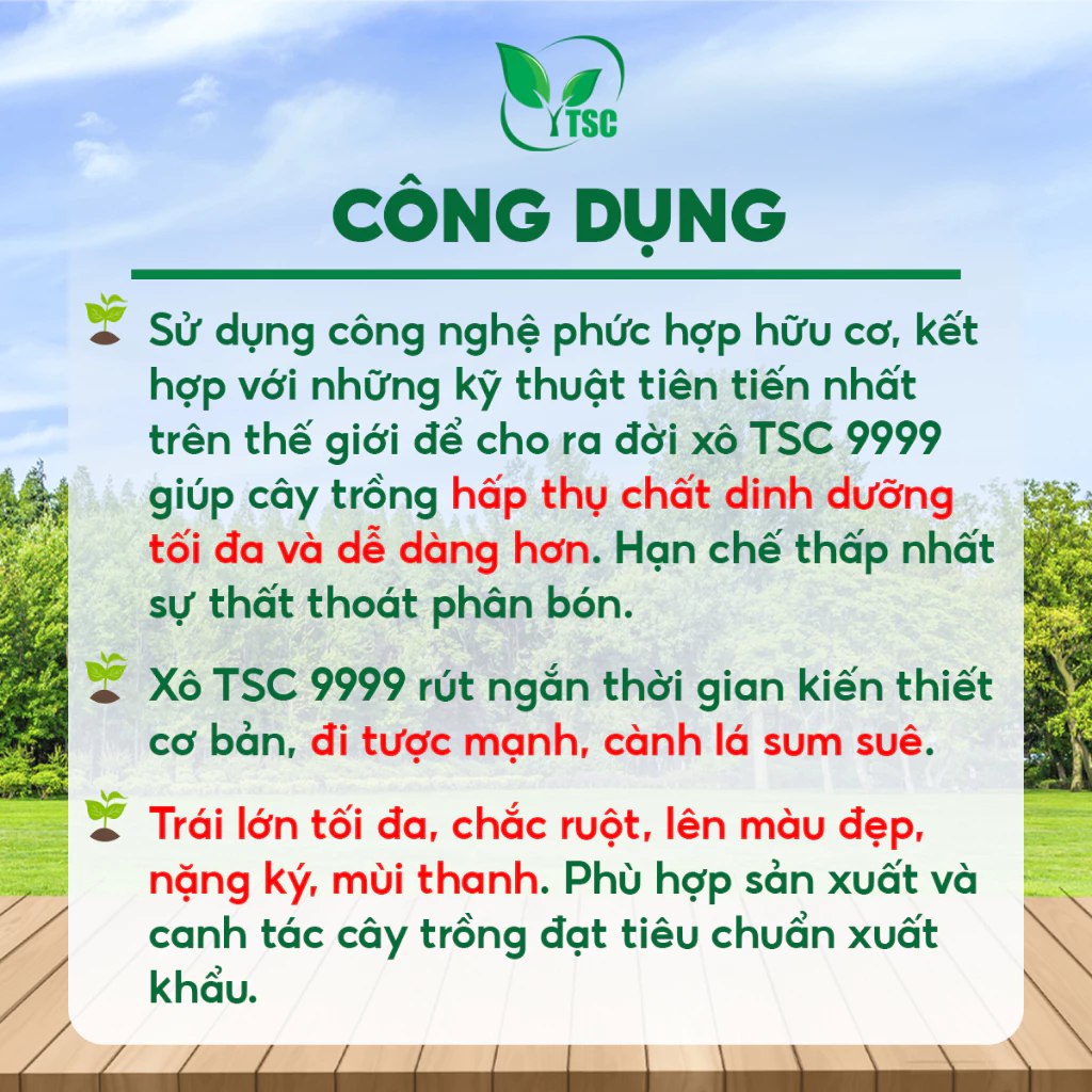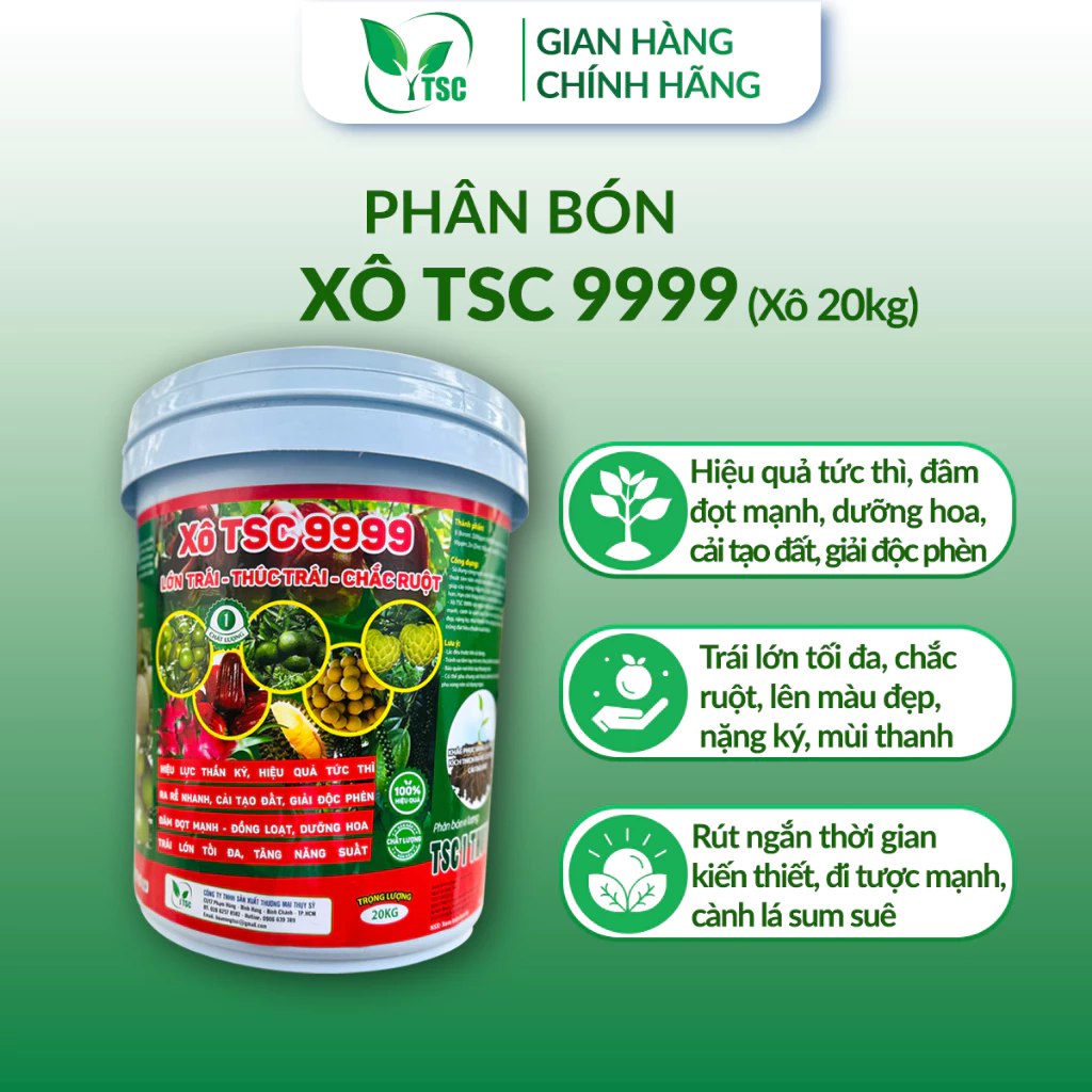 - Sử dụng công nghệ phức hợp hữu cơ, kết hợp với những kỹ thuật tiên tiến nhất trên thế giới để cho ra đời xô TSC 9999 giúp cây trồng hấp thụ chất dinh dưỡng tối đa và dễ dàng hơn. Hạn chế thấp nhất sự thất thoát phân bón.